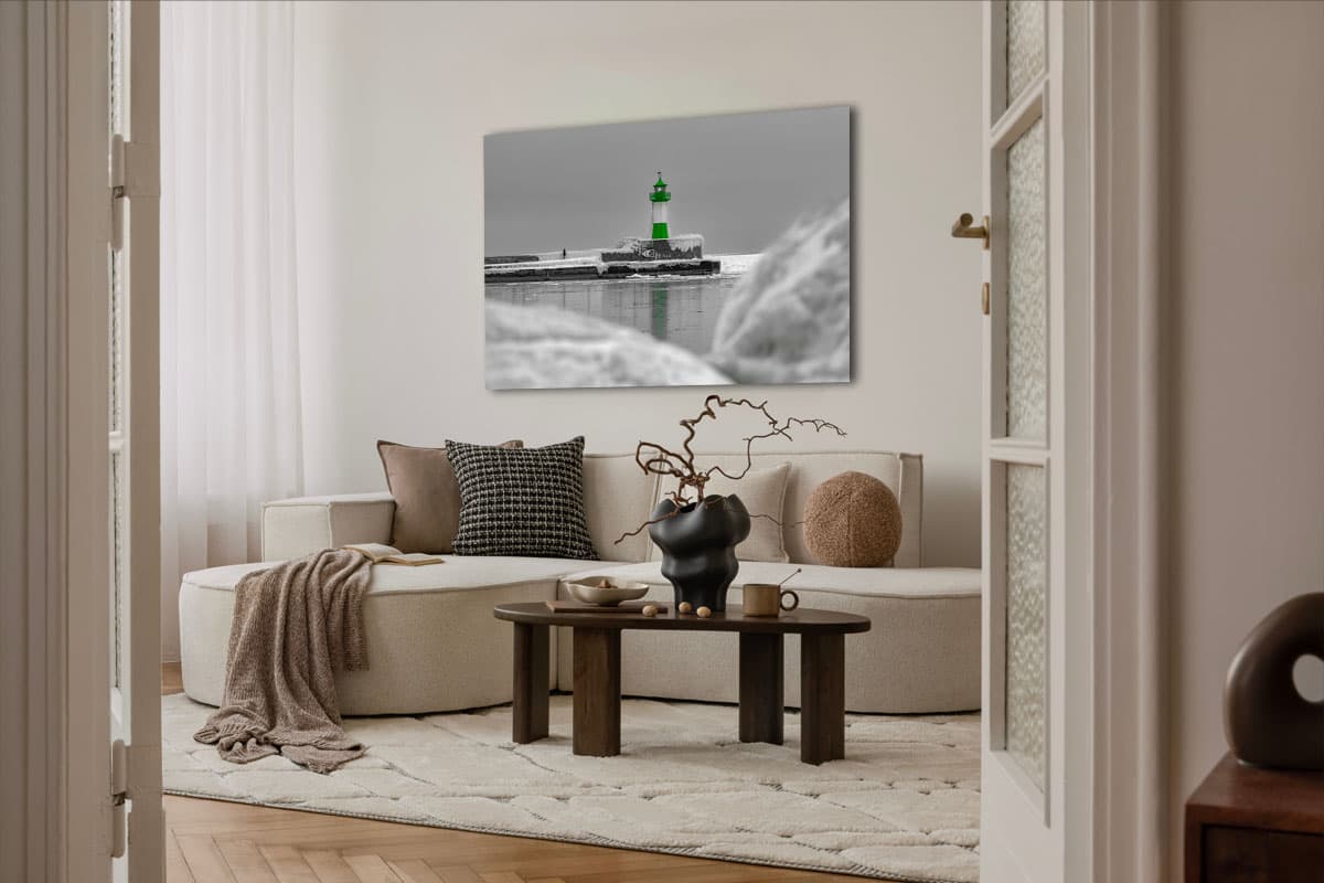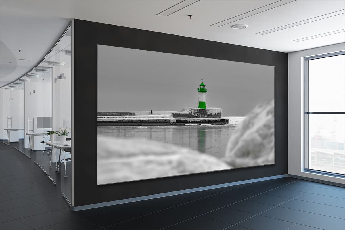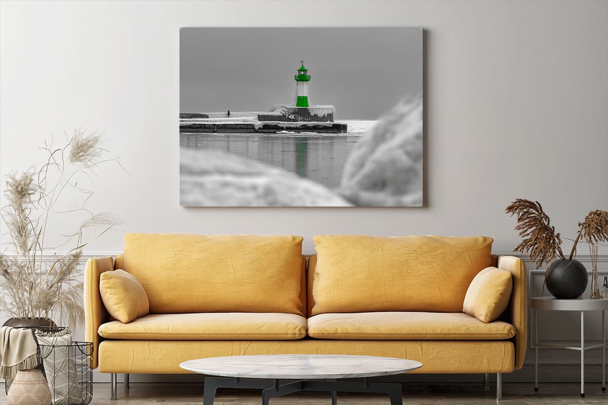 Durch die gezielte Selective-Color-Bearbeitung (Color-Key) sticht das charakteristische Grün des Leuchtturms aus der frostigen, fast monochromen Winterlandschaft hervor. Eine einsame Gestalt auf der Mole unterstreicht die Weite und die stille Melancholie dieses Moments.